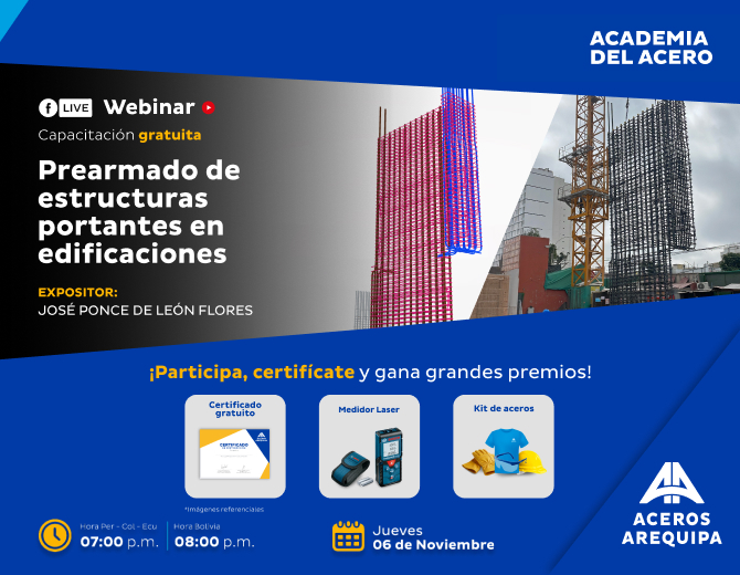 Así mismo se informa que los datos podrán ser usados por Aceros Arequipa, por sus aliados, organizadores y/o posibles patrocinadores, cuyas marcas, nombres y logos son visibles en el desarrollo del evento/servicio, con la finalidad de gestionar la certificación de su asistencia, cuando aplique, así como para contactarle para obtener información sobre la calidad del evento/servicio, invitarlo a otros eventos/servicios de su interés, desplegar acciones de mercadeo, prospección comercial y acciones que redunden en el desarrollo de nuestros clientes.