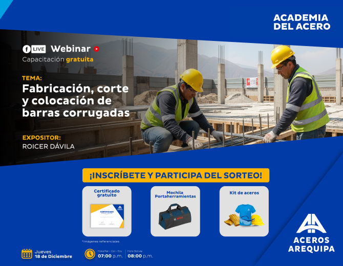 Así mismo se informa que los datos podrán ser usados por Aceros Arequipa, por sus aliados, organizadores y/o posibles patrocinadores, cuyas marcas, nombres y logos son visibles en el desarrollo del evento/servicio, con la finalidad de gestionar la certificación de su asistencia, cuando aplique, así como para contactarle para obtener información sobre la calidad del evento/servicio, invitarlo a otros eventos/servicios de su interés, desplegar acciones de mercadeo, prospección comercial y acciones que redunden en el desarrollo de nuestros clientes.
